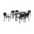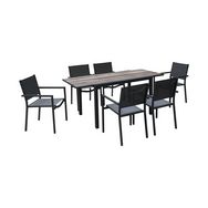Les + produit :- Table extensible 6 places 120/180cm en aluminium- 6 fauteuils aluminium et textilène incluses- Structure aluminium résistante- Plateau design effet bois La table de jardin Nashville deviendra un élément indispensable dans vos espaces extérieurs. Son caractère extensible, passant de