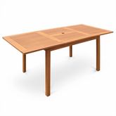 La table Malaga est grande rectangulaire en bois exotique d',extérieur. Elle est dotée d&rsquo,une rallonge papillon de 60cm pour passer de 1,2m à 1,8m de long. Une fois étendue, la table peut accueillir un parasol en son centre, de 50mm diamètre ou d&rsquo,un diamètre inférieur.