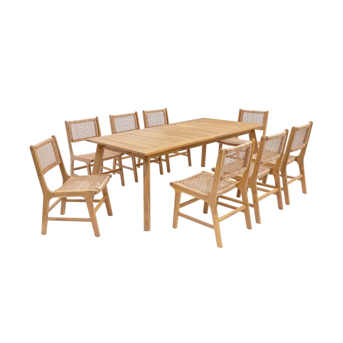 Les + produit :Ce set comprend la table Palena et 8 chaises OcaraStructure en bois d'acaciaTeinte naturelle et chaleureuseAssise et dossier en résine tressée imitation osierFacilité d'entretienVous allez adorer la table de jardin Palena. Conçue entièrement en bois d'acacia, elle promet robustesse et