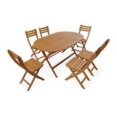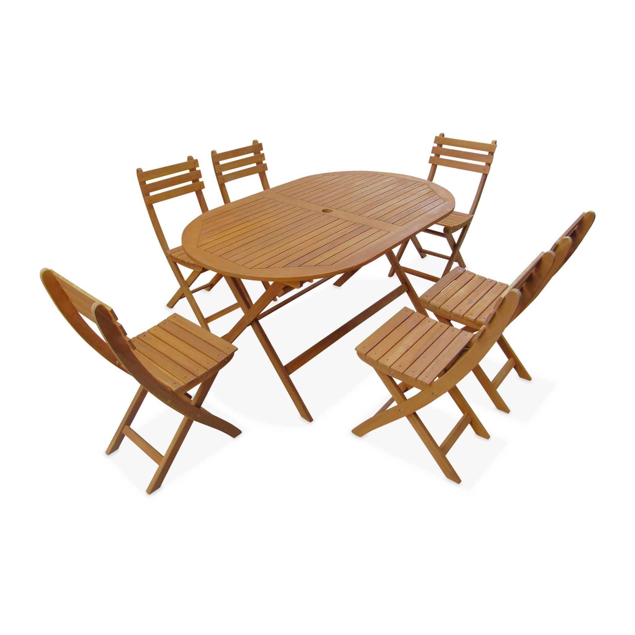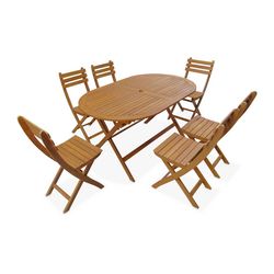 Table de jardin pliante bois d'acacia + 6 assises 150cm en bois d'acacia déjà huilé. forme ovale avec 6 chaises pliables