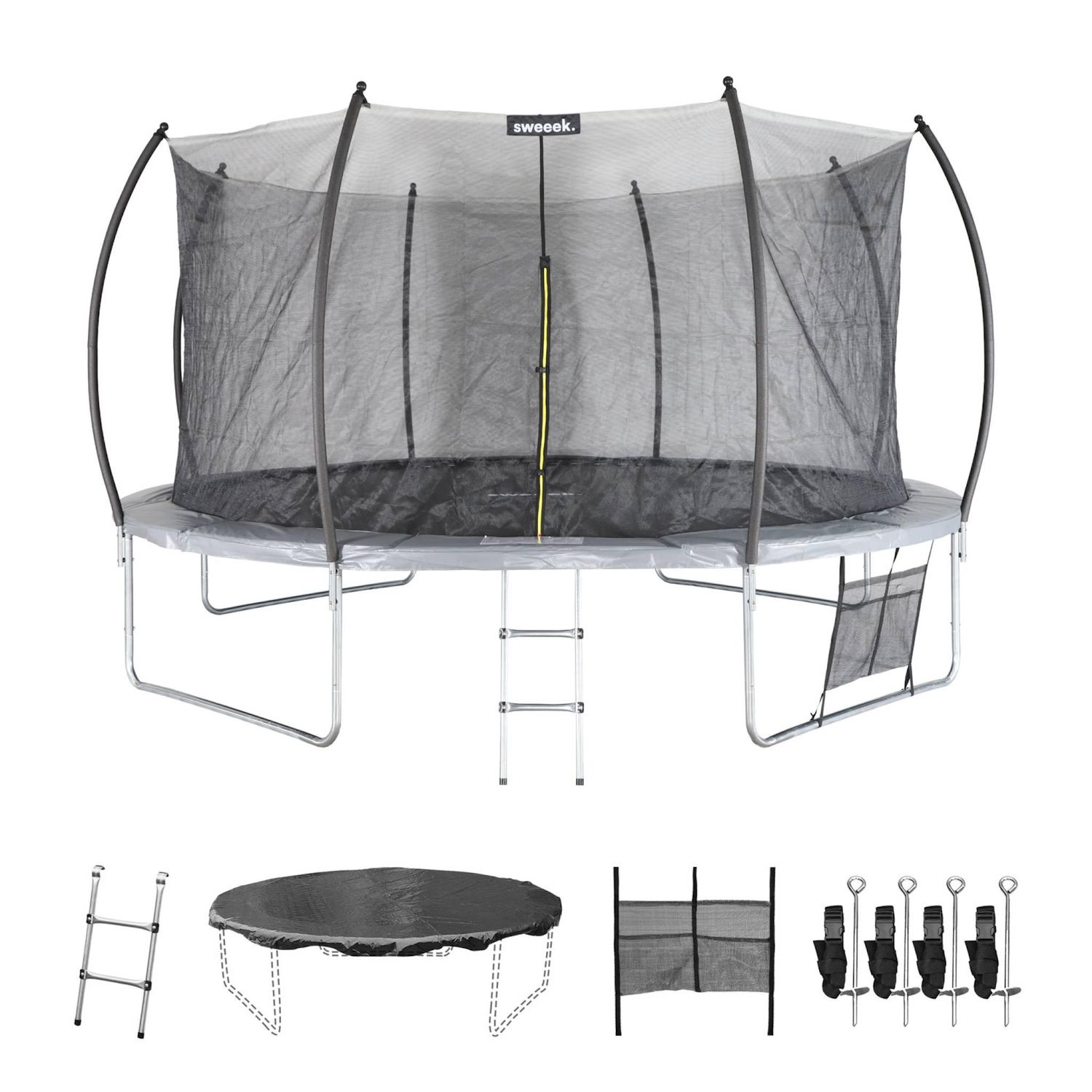 Trampoline rond Ø 430cm gris avec filet de protection intérieur - Venus Inner XXL – échelle. bâche. filet pour chaussures et kit d'ancrage 4.30m 430 cm