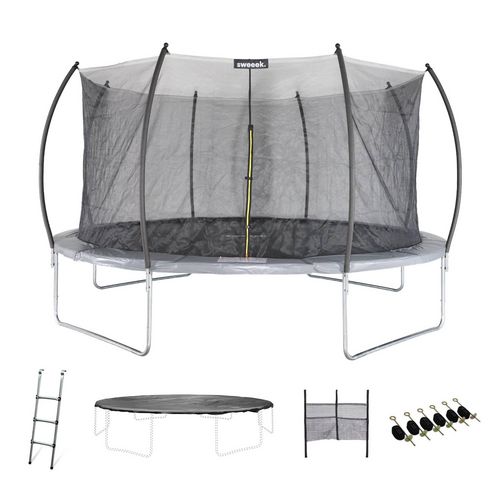 Trampoline rond Ø 490cm gris avec filet de protection intérieur - Jupiter Inner XXL - échelle. bâche. filet pour chaussures et kit d'ancrage 4.90m 490 cm