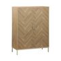Ce meuble s'inspire du parquet point de Hongrie. Son décor chevrons lui confèrent un aspect raffiné et élégant tandis que sa couleur naturelle lui donne un aspect authentique. Ce meuble s'intégrerait parfaitement dans une pièce de style contemporain. Ses pieds et ses poignées sont en métal couleur champagne, pour le rendre encore plus élégant. Ce meuble serait un excellent ajout à toute cuisine ou salle à manger.