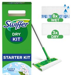 Le kit de démarrage Swiffer Dry est la solution idéale pour nettoyer les sols à sec en un rien de temps et ainsi attraper et retenir la poussière et les poils sur toutes les surfaces de votre maison et même dans les endroits difficiles d'accès, comme sous le canapé ou le lit. L'épaisseur et la conception spécifique des lingettes combinées avec leur capacité électrostatique permettent d'attirer et emprisonner 3 fois plus qu'un balai classique tout en répandant un fraîcheur longue durée dans la pièce. Swiffer Dry vous permet de retrouver une maison propre en un rien de temps, sans effort et sans bruit. Saviez-vous que le balai est aussi compatible avec les recharges humides Swiffer ? Les lingettes sont conçues avec une solution de nettoyage unique qui dissout efficacement les taches tenaces, la saleté et la crasse et les absorbe en profondeur dans la lingette, pour des sols impeccables et un nettoyage facile du carrelage ou du linoléum. Grâce à son action de brossage améliorée et à la bande grattante bleue, il est facile de se débarrasser des taches tenaces. Votre balai Swiffer est désormais un outil 2 en 1 : à utiliser avec les lingettes sèches pour attraper la poussière et les lingettes imprégnées pour nettoyer les sols ! Elles peuvent également être utilisées en toute sécurité sur les sols en bois. Ne pas utiliser les lingettes imprégnées du balai Swiffer sur les surfaces en bois brut, huilées ou cirées, les carrelages non scellés et les moquettes. Les lingettes Swiffer peuvent être utilisées sur toutes les surfaces dures, notamment : sols en linoléum, vinyle et céramique ne pouvant être cirés, ainsi que les parquets vitrifiés.