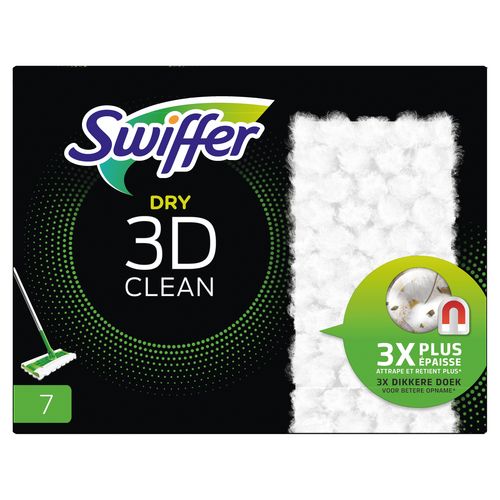 Les lingettes sèches Swiffer Nettoyage 3D permettent d'attraper et retenir la saleté, les poussières et les poils des sols de votre maison. Il vous suffit de fixer une recharge sur votre Swiffer Balai Attrape-Poussière d'origine pour un nettoyage rapide et facile. Les recharges de lingettes Swiffer standard attrapent et retiennent la poussière 3 fois mieux qu'un balai classique. Les recharges de lingettes pour sols Swiffer Nettoyage 3D sont 3 fois plus épaisses que les recharges Swiffer standard et offrent des résultats encore plus impressionnants. Utilisez Swiffer en complément de votre aspirateur, pour attraper la poussière fine restante, ou entre deux nettoyages complets. L'épaisseur des lingettes sèches et leur motif unique permettent d'attraper et retenir la poussière, la saleté et les poils. La tête pivotante à 360° du Swiffer Balai Attrape-Poussière atteint facilement les coins et rebords. La tête du balai est plate, pour vous permettre de nettoyer les endroits difficiles d'accès qu'un aspirateur ne pourrait pas atteindre, tels que sous le canapé, le lit ou les placards. Bon à savoir : Les lingettes sèches Swiffer conviennent pour attraper les poils d'animaux de compagnie, qui en perdent tout le temps, ou si vous êtes allergique à la poussière. Les lingettes sèches Swiffer peuvent être utilisées sur toutes les surfaces dures telles que : les sols en linoléum, vinyle et céramique pouvant être cirés ou non, ainsi que les parquets vitrifiés.