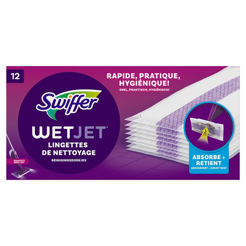 Les lingettes nettoyantes Swiffer WetJet sont rapides, pratiques, hygiéniques et parfaites pour les salissures quotidiennes. Fixez simplement une lingette fraîche sur la tête de balai-laveur WetJet pour absorber et retenir la saleté, pour un sol impeccable et sec. La lingette multi-couches emprisonne la saleté et la crasse en profondeur en son centre pour éviter qu'elles se redéposent. Lorsque vous avez terminé, retirez simplement la lingette nettoyante et jetez-la, et avec toute la saleté définitivement éliminée. Rien de plus simple. (Ne pas utiliser sur les parquets en bois brut, huilés ou cirés, les carrelages non scellés, les moquettes et les sols coulés)