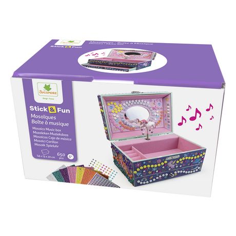 Décore une magnifique boîte à musique, il suffit de coller les petites mousses et joyaux étincelants sur les graphismes correspondants et le tour est joué ! Contient :1 boîte à musique (19x12,5x11,8 cm) à réaliser, plus de 500 mosaïques colorées, 150 gems.