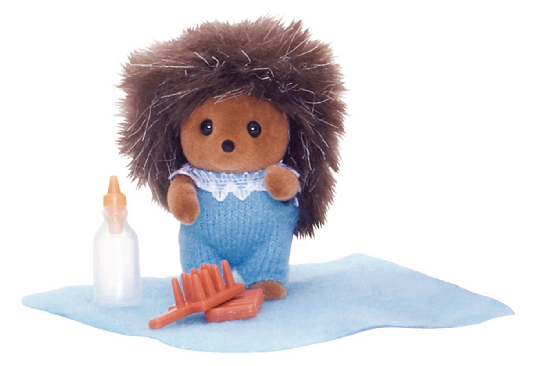 1 bébé hérisson, 1 plaid, 1 biberon, 1 peigne, 1 brosse à cheveux