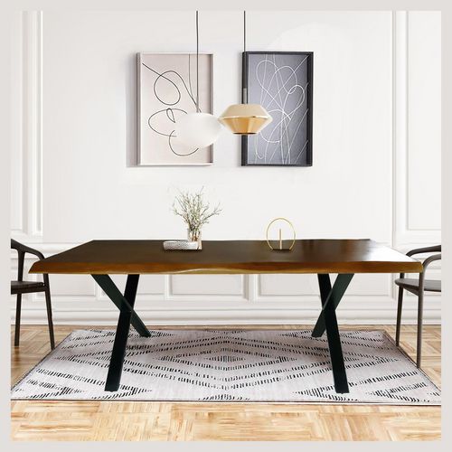 La table à manger LISBONNE, pouvant accueillir 8 personnes, est une véritable œuvre d'art en acacia massif. Son design rectangulaire, agrémenté de courbes qui épousent les lignes naturelles du bois, confère à votre espace de vie une atmosphère de noblesse et de modernité. Les deux pieds en croix en métal, non seulement apportent une stabilité impeccable mais aussi un aspect design et contemporain. La finition huilée du plateau met en valeur la beauté intrinsèque de l'acacia, tout en facilitant l'entretien. Cette table allie avec élégance le charme authentique du bois massif et un design industriel chic, faisant d'elle un choix parfait pour toute salle à manger recherchant à combiner esthétique et fonctionnalité.
