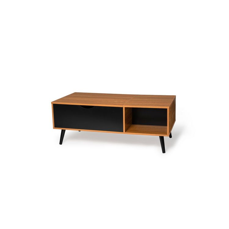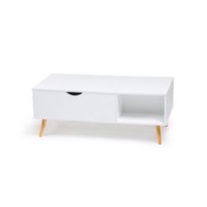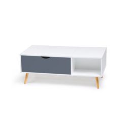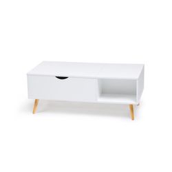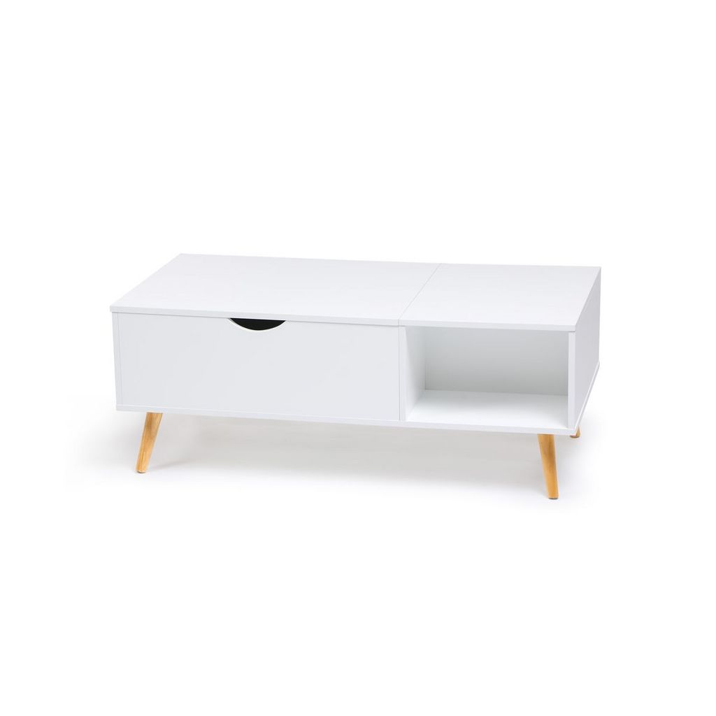 La table basse a une fonction relevable très pratique pour prendre un verre ou même déjeuner dans votre salon. Elle dispose également d'une niche pour y ranger vos livres ou déco. Avec sa forme rectangulaire et son association de blanc et pieds bois en font une pièce tendance et parfaite pour un style moderne et design.
