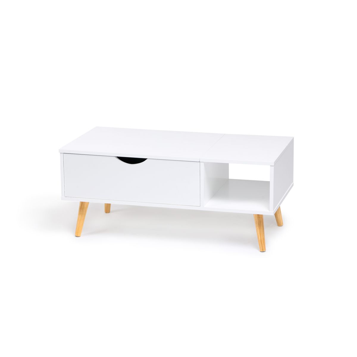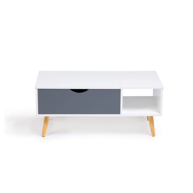 La table basse a une fonction relevable très pratique pour prendre un verre ou même déjeuner dans votre salon. Elle dispose également d'une niche pour y ranger vos livres ou déco. Avec sa forme rectangulaire et son association de blanc et pieds bois en font une pièce tendance et parfaite pour un style moderne et design.