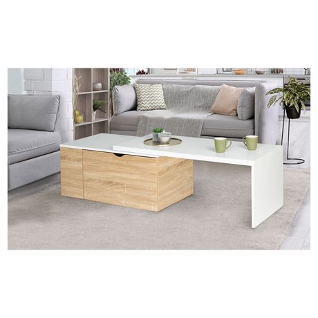 Table rotative à 360° Maryse _Matériaux: 15mm PB Mélamine _Couleur : Bois / Blanc _Dimensions générales :(L x l x H) 100-146.5 x 48 x 40 cm _Visserie incluse: oui _Informations supplémentaires : _Dimensions de la porte : 60 x 34.5 cm _Espace entre les étagères : 16 cm _Hauteur table pliée : 36.5 cm _Hauteur table dépliée : 40 cm _Placard de rangement avec étagère