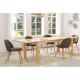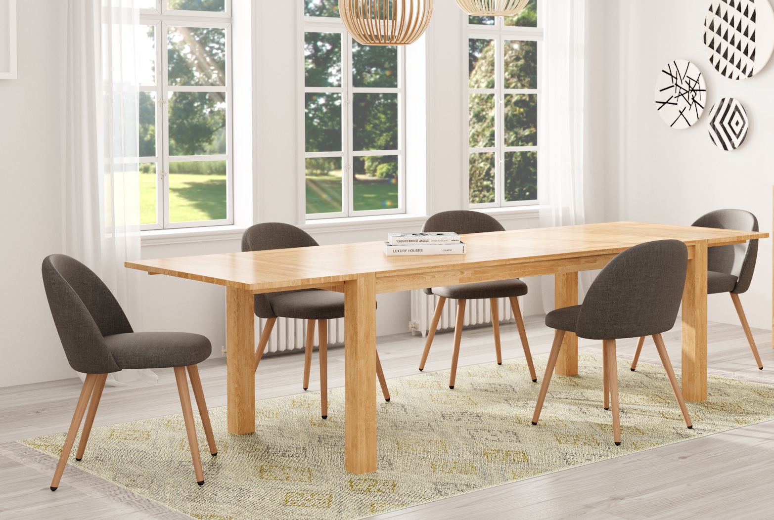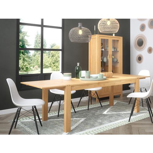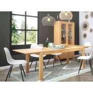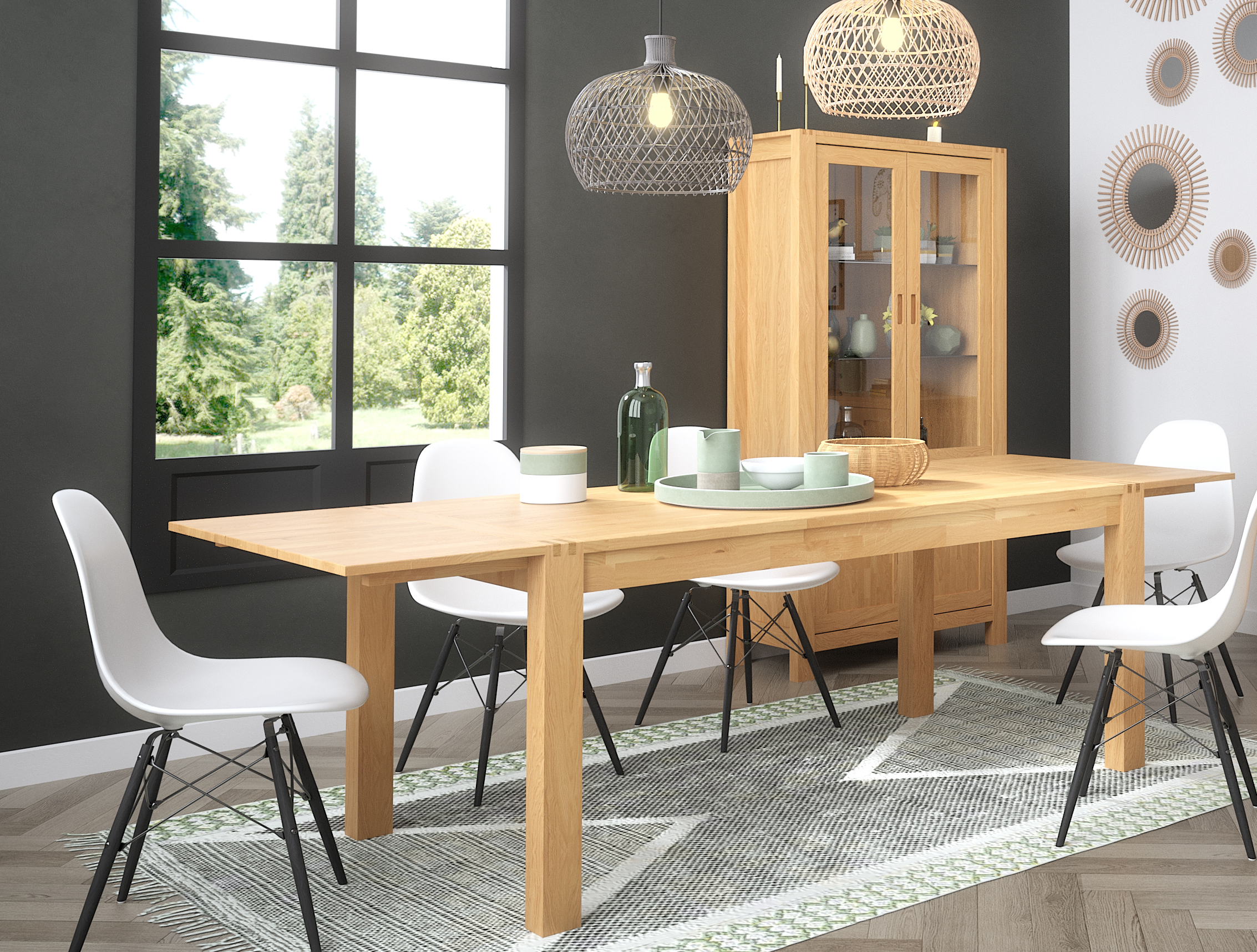 Table plateau et pied en chêne massif et chêne abouté. Table pouvant accueillir 2 allonges en bout de table pour passer de 8 à 12 personnes.