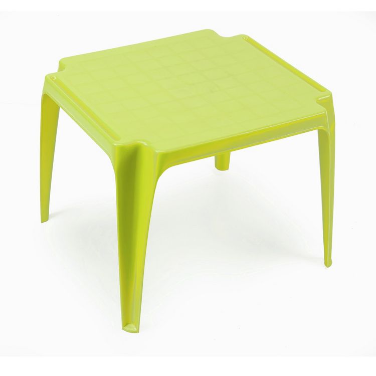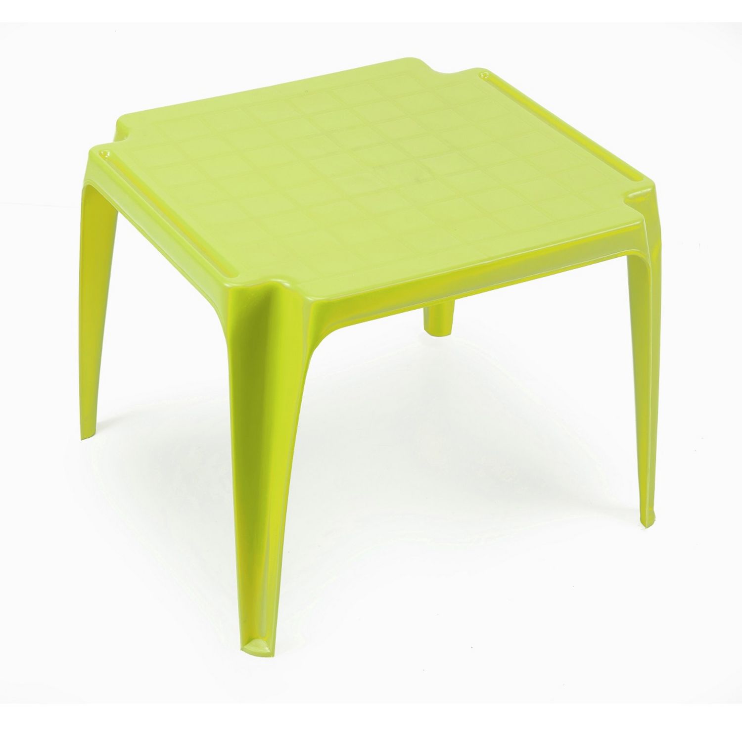 Table de jardin enfant 100% polypropylène de coloris vert anis. La table de jardin est de dimension 55x50x44cm.
