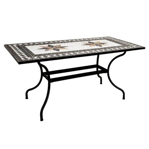 Informations Techniques : Dimensions : L. 160 x l. 90 x H. 75 cm Matières : Fer, Grès, Pierre & Ciment Spécificités : Design & Tendance Motif du plateau en mosaïque A monter soi-même Facile d'Entretien & d'Utilisation Poids : 67 kg Couleur : Noir