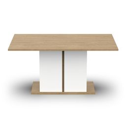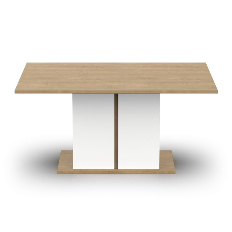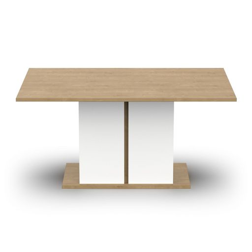 Table repas en panneaux de particules 15, 22 et 25mm. Décor mélamine chêne hamilton et blanc mat. Charge maximale : 50kg