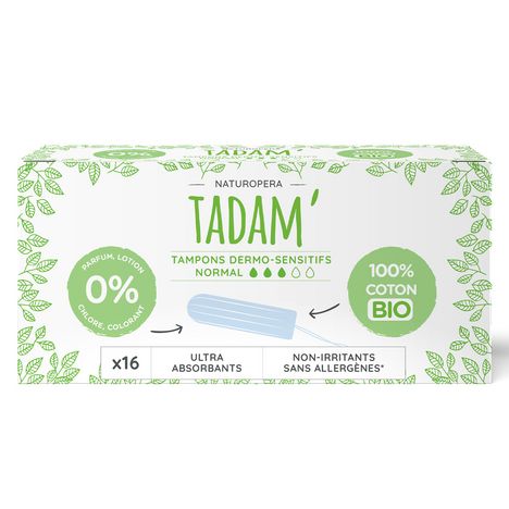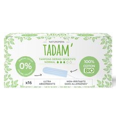 TADAM' - Tampons Dermo-Sensitifs Normal x16 Absorption optimale grâce à son cœur composé à 100% de coton bio Forme anatomique pour un confort et une protection totale Cordon en coton bio pour un retrait facilité Contact avec la peau et les muqueuses en 100% naturel et bio Hypoallergéniques Testés sous contrôle dermatologique et gynécologique Labellisation SWAN qui implique un impact carbone réduit