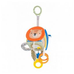 Un cube avec de nombreuses activités: feuilles bruissantes, miroir, crinière du lion à mordiller, tissu à attraper, anneau de dentition, anneaux en plastique et textures variées Facile à attraper pour les petites mains Possibilité de le suspendre facilement grâce à l'anneau en plastique