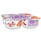 Avec sa gamme de recettes au fromage blanc, Taillefine vous invite à savourer l'onctuosité d'une spécialité laitière 0% de MG et riche en vitamine D, alliée au plaisir de parfums gourmands pour combler toutes vos envies. Spécialité laitière à la fraise, avec sucre et édulcorants , enrichie en vitamine D
