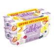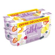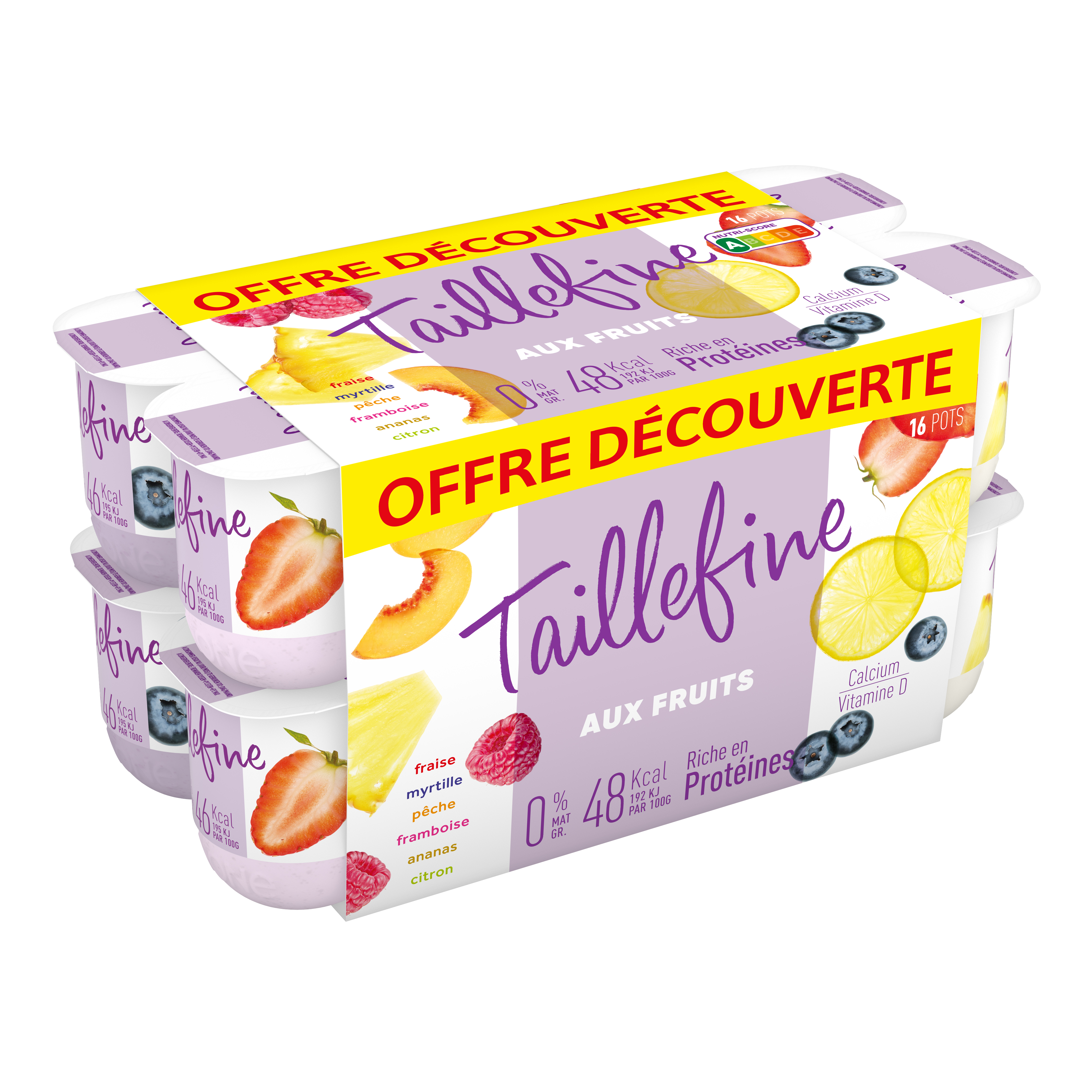 Panaché de Framboise - Ananas - Citron - Fraise - Myrtille - Pêche. Faites-vous plaisir avec Taillefine aux fruits, une recette gourmande à la texture onctueuse, à laquelle se marient de délicieux morceaux de fruits. Et bien sûr, les Taillefine aux fruits sont 0% de matière grasse et sans sucres ajoutés. Yaourt brassé aux fruits, aromatisé, avec édulcorants, enrichi en vitamine D