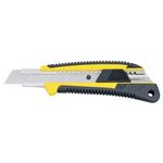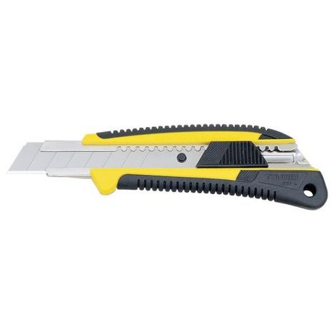Cutter 18 mm pro bi-matière avec blocage automatique par bouton. Corps en acier avec manche bi-matière.