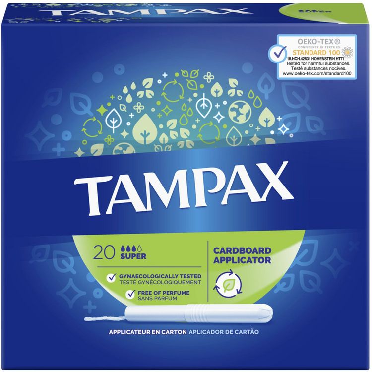 Les tampons Tampax Super avec applicateur en carton aident à vous apporter une sensation de fraîcheur en toute confiance. Les tampons Tampax possèdent un cœur absorbant et une jupette anti-fuites pour une protection supplémentaire, ainsi qu’un applicateur en carton doté d’un grip antidérapant pour une insertion facile. Les tampons Tampax Super avec applicateur en carton sont adaptés aux jours de flux moyen à abondant. Pour une sensation de fraîcheur en toute confiance. Essayez Tampax Compak Pearl, la meilleure protection de la gamme Tampax. Les tampons Tampax sont sans parfum et sans colorant, ils sont testés sous contrôle gynécologique et testés indépendamment par Oeko-Tex sur la présence des substances indésirables. Tampax Super Tampons Applicateur x20