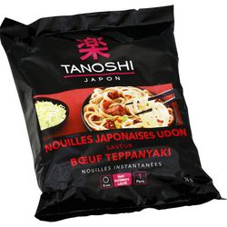 Préparation céréalière instantanée à base de farine de blé et préparation pour assaisonnement saveur boeuf Les Udons font partie des nouilles les plus consommées au Japon. Ces nouilles, à base de blé, larges, plates et particulièrement fondante sont assaisonnées à la saveur "teppanyaki". C'est une technique de cuisson japonaise où le bœuf est grillé sur une plaque chauffante avec de la sauce soja. Prête en 4min, cette recette est une invitation au voyage le temps d'un repas.