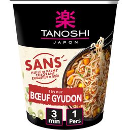 La saveur « Bœuf Gyudon » qui accompagne ces nouilles est tirée d’un plat incontournable de la gastronomie nippone composé de lamelles de bœuf, d’oignons et de sauce soja. Cette cup est SANS huile de palme, SANS colorant, SANS exhausteur de goût et SANS matière grasse. Préparation céréalière instantanée et préparation pour assaisonnement saveur boeuf gyudon