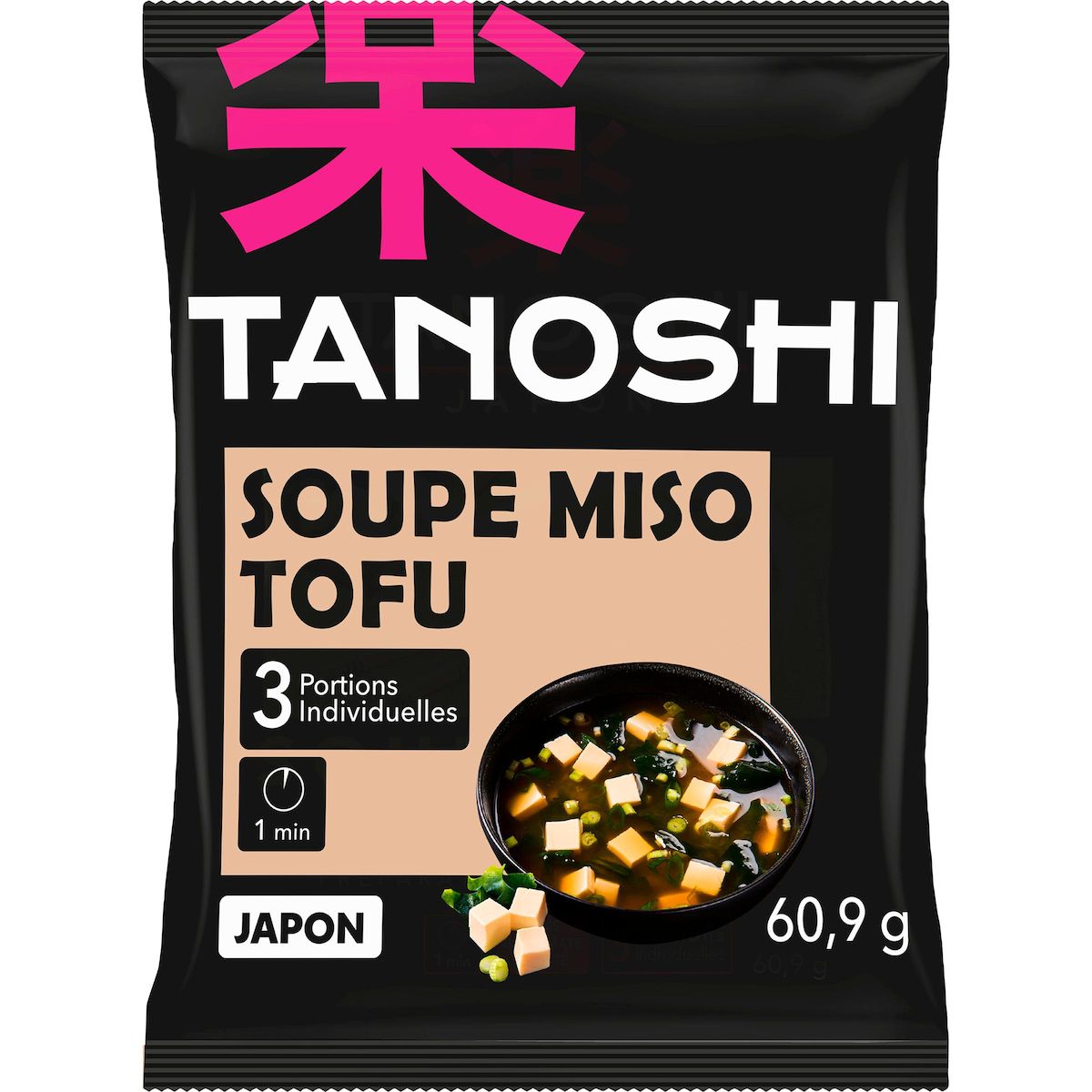 PÂTE DE MISO : pâte de SOJA 66,8% (SOJA, eau, riz, sel, alcool), eau, alcool, sel, exhausteurs de goût: inosinate disodique, guanylate disodique; extrait de levure. PRÉPARATION À BASE DE TOFU : tofu 3.4% (fèves de SOJA, gélifiant : sulfates de calcium), algue wakame 1.9%,oignons verts 0.9%. Peut contenir des traces de gluten, crustacés, oeufs, poissons, lait, mollusques, moutarde, arachides et graines de sésame.