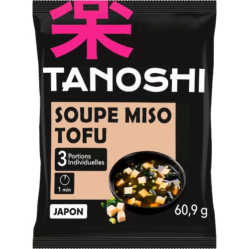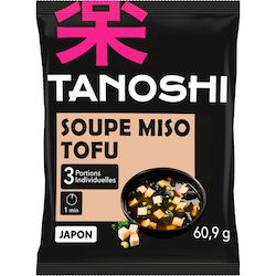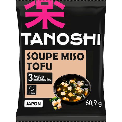 Porter à ébullition 160 ml d'eau. Mettre le contenu du sachet de pâte Miso dans un bol. Verser l'eau bouillante en remuant délicatement. Ajouter le sachet de tofu et algue en remuant, laisser reposer 1 minute.