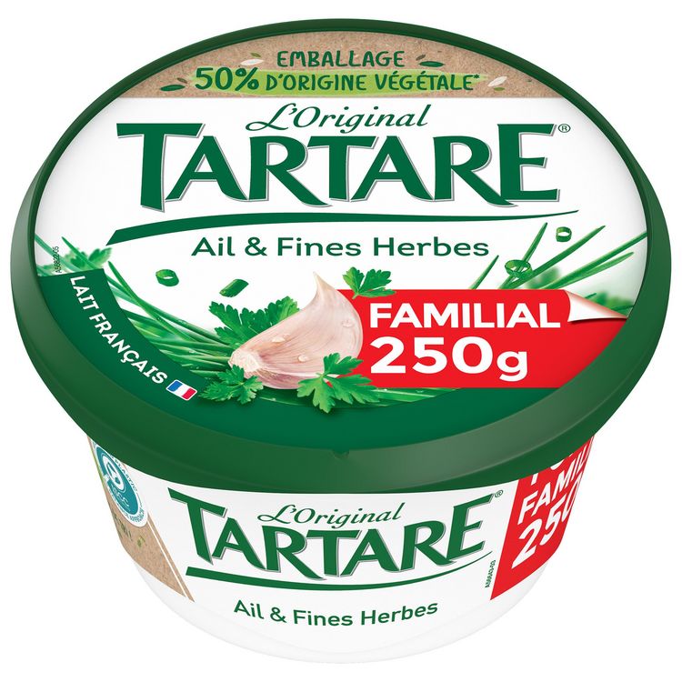 Retrouvez la recette unique Tartare® Ail et Fines Herbes qui préserve le goût intense et naturel d'herbes fraîches dans un format 250g, adapté aux gros consommateurs, disponible en colis présentoir avec 3 facings.