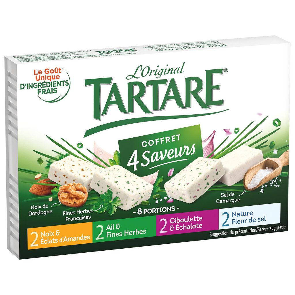 Laissez-vous tenter par la fraîcheur et l'intensité Tartare® grâce à ces 4 saveurs variées et gourmandes : Ail et Fines Herbes, Noix et Eclats d'Amandes, Nature et fleur de sel, Herbes et Ciboulette et Echalote.