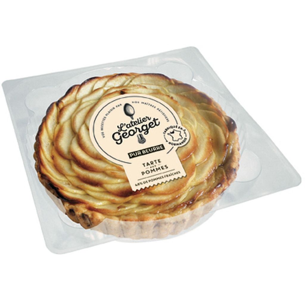 Tarte aux pommes 550 g Pâte pur beurre. Fines lamelles de pommes fraîches disposées en rosace, à la main, sur un lit de compote.