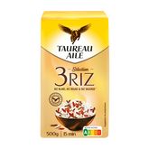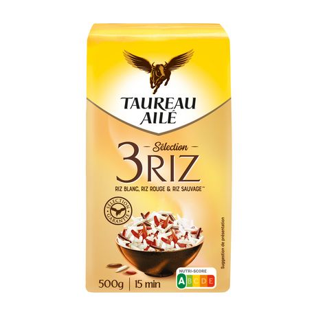 3 couleurs, 3 saveurs, 3 textures pour encore plus de plaisir! La Sélection 3 riz de Taureau Ailé, c'est l'alliance unique du moelleux du riz long grain, du goût noisette du riz sauvage** et du croquant du riz rouge. Ce mélange apporte couleurs et saveurs à vos plats de fête ou vos repas de tous les jours. Le riz long grain : Grain fin et allongé. Texture tendre et légère. Le secret moelleux. Le riz rouge : Grain charnu et rouge. Texture ferme et légère. Le secret brut et authentique. Le riz sauvage** Grain allongé et brun. Texture ferme. Le secret parfum noisette.