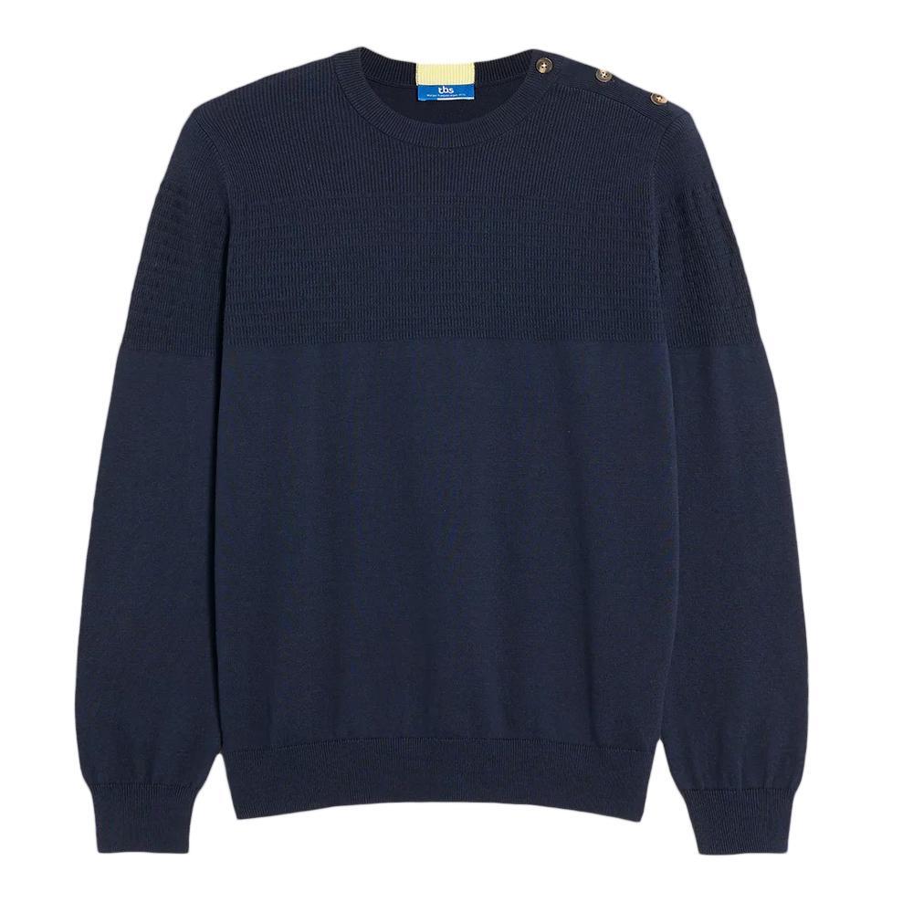 Craquez pour ce pull de la marque TBS !- Composition : 70%Coton, 30%Alginate- Manches longues avec bas resserrant en côtes- Col rond- Coloris : Marine