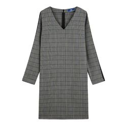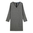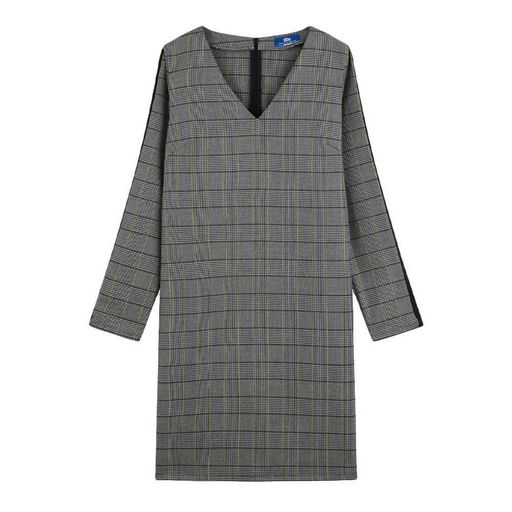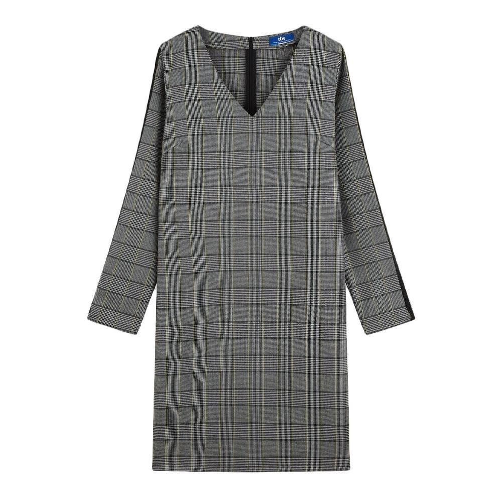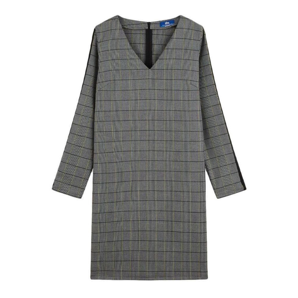 Optez pour cette robe femme de la marque TBS.Manches longuesCol VTissu à carreauxColoris : Gris/Noir/JauneFermeture à zip dans le dosComposition : 64% polyester , 34% viscose , 2% élasthanne