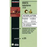 25 rivets tubulaires acier / laiton.Diamètre x longueur : 8 x 12 mm, diamètre perçage : 8,1 mm, épaisseur à sertir : 4 à 8 mm.Matériaux : matériaux friables, cuirs, plastiques, ...Applications : pour fixation avec accès des deux côtés. Renforcement de fixations existantes.Par exemple : électricité,