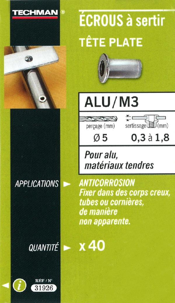40 écrous M4 à sertir alu avec tête plate.Epaisseur à sertir : 3 mm, longueur filetage : 6 mm.Rivets creux taraudés pour fixation démontable sur les toles, tubes, cornières, &hellip,