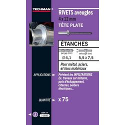 75 rivets étanches alu / acier à tête plate.Diamètre x longueur : 4 x 10 mm, diamètre perçage : 4,1 mm, épaisseur à sertir : 4 à 6 mm.Matériaux : métal, acier, &hellip,Applications : préviennent des infiltrations.Par exemple : travaux sur toitures et chêneaux, pots d&rsquo,échappement, citernes, boÎ