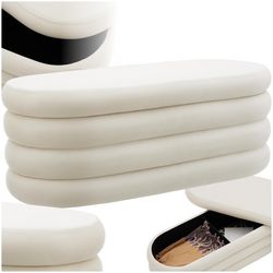 Banc rembourré 2 grands compartiments de rangement Aspect velours crème/ blanc