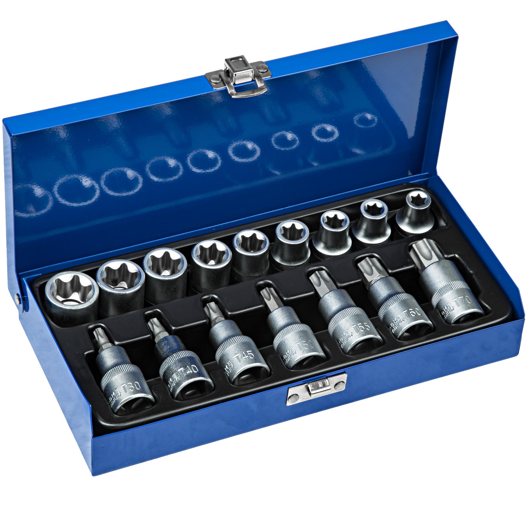 Set, Coffret à Outils, Boîte, avec 16 Douilles ½“ Torx Acier Chrome Vanadium Bleu TECTAKE. Set d'outils pratique composé de 16 douilles ½“ robustes. Idéal pour les bricoleurs. En acier chrome vanadium. Coffret en métal maniable et agencée pour ranger les outils. Points Forts: Outils de qualité en ac