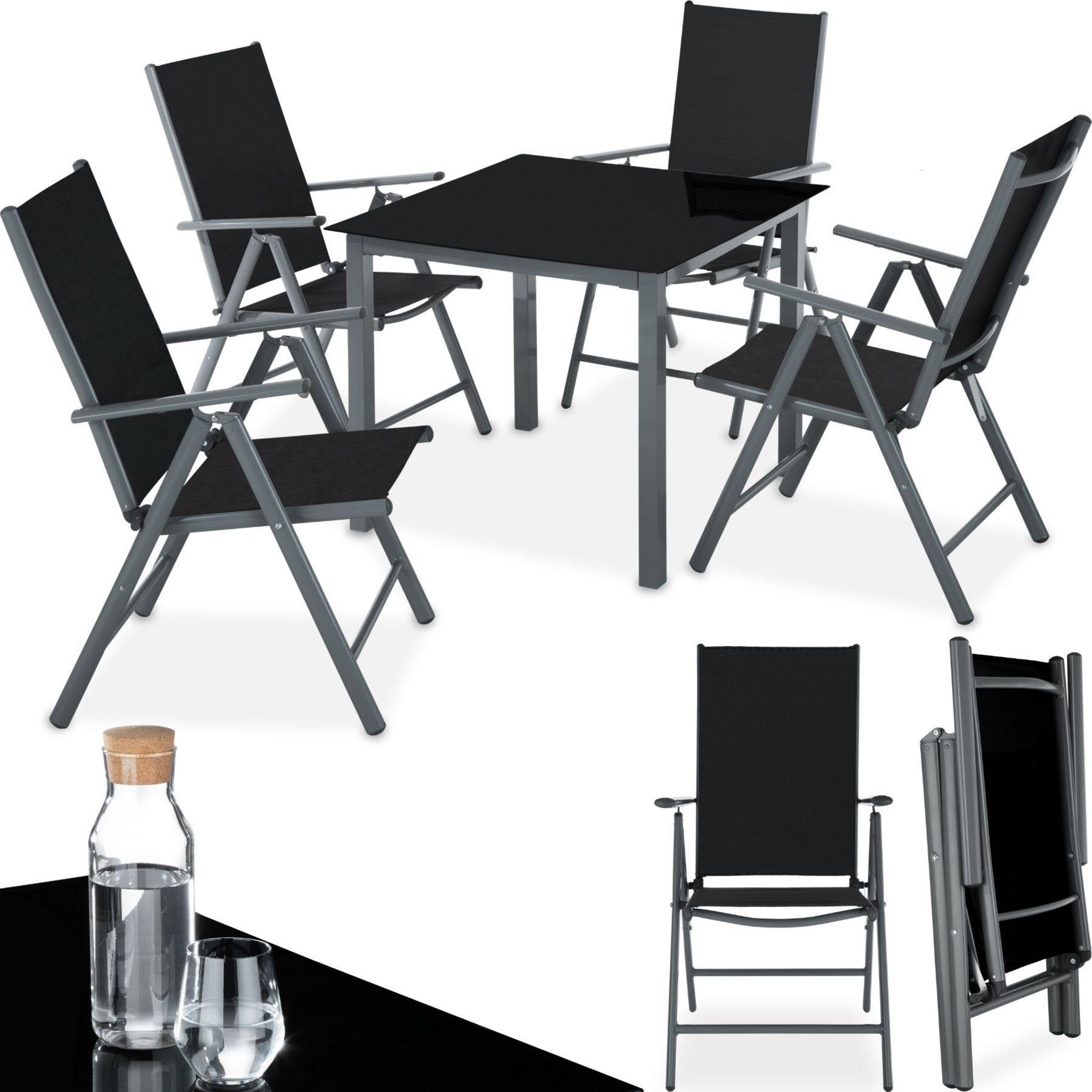 Salon de Jardin avec 4 Chaises Pliantes et 1 Table en Verre et en Aluminium TECTAKE. Le salon de jardin durable en aluminium va vous séduire par son design moderne. Idéal pour passer des moments agréables dans votre jardin, sur votre terrasse ou sur votre balcon. La table de qualité est dotée d'u