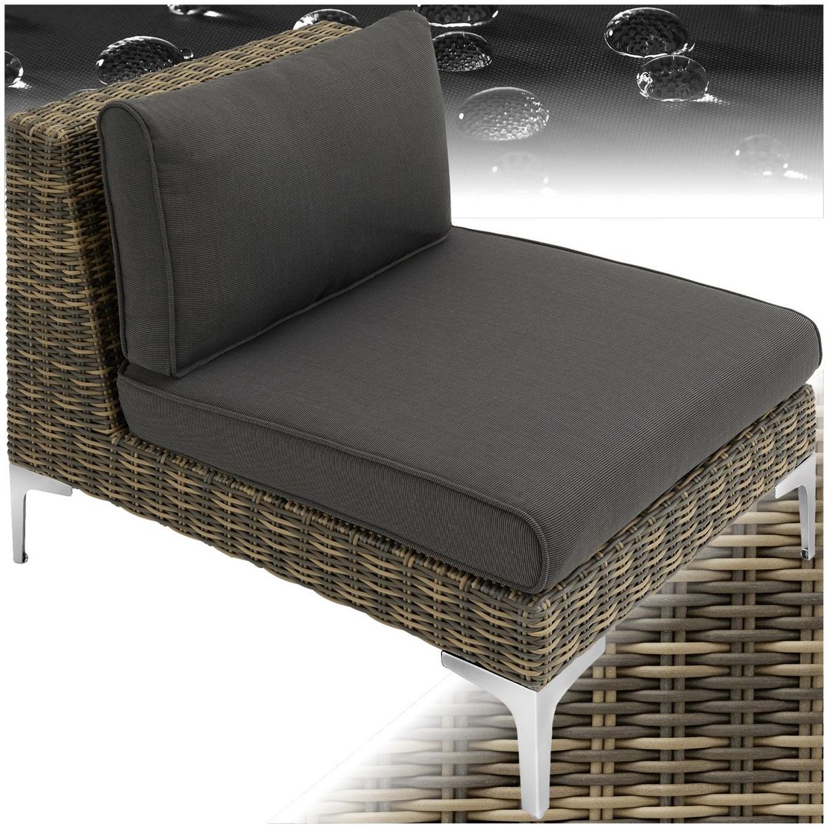 Créez une ambiance de vacances dans votre jardin avec la partie centrale accueillante de l'ensemble modulaire en rotin Villanova de tectake. Les coussins épais dotés de housses hydrofuges faciles à retirer et à nettoyer garantissent un grand confort. Les matériaux utilisés pour le tressage et les ca