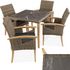 En savoir +Accueille la journée avec un bon petit déjeuner ou termine la soirée avec une boisson cool sur cet ensemble de sièges stylés de tectake. La combinaison intéressante de la structure en bois, du tressage en plastique, des éléments en bois et du solide plateau en grès cérame attire tous les regards. Les matériaux utilisés convainquent par leur stabilité, leur capacité de charge ainsi que leur insensibilité et leur résistance aux intempéries. Bien entendu, le confort est une priorité pour cet ensemble de grande qualité - les coussins confortables, les accoudoirs incurvés et les dossiers agréables font de cet ensemble de cinq pièces une zone de chillout de rêve.