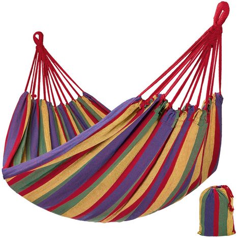 En savoir +Hamac, Hamac Suspendu, Hamac double, Hamac XXL Multicolore - 210 cm x 150 cm TECTAKE + Sac de rangement ou de transport. Le hamac TECTAKE Relax offre un grand espace de détente après une journée bien remplie. Profitez à l'intérieur ou à l'extérieur du grand confort offert par le hamac et laisser vagabonder votre esprit. Avec son grand espace de couchage, il convient même pour accueillir plusieurs personnesLa détente est à l'ordre du jour grâce au hamac confortable de tectake. Installez-vous confortablement dans le sens de la longueur ou en diagonale dans le grand drap et profitez de son tissu respirant qui assure un échange d'air agréable. Les cordes solides qui permettent de suspendre et d'enlever facilement le hamac en toile garantissent une haute stabilité et une excellente sécurité. Grâce à son sac de rangement pratique et à son faible poids, vous pouvez emporter cet ingénieux espace de repos et partout avec vous - pour la randonnée, le camping, les vacances ou tout simplement dans votre propre jardin.