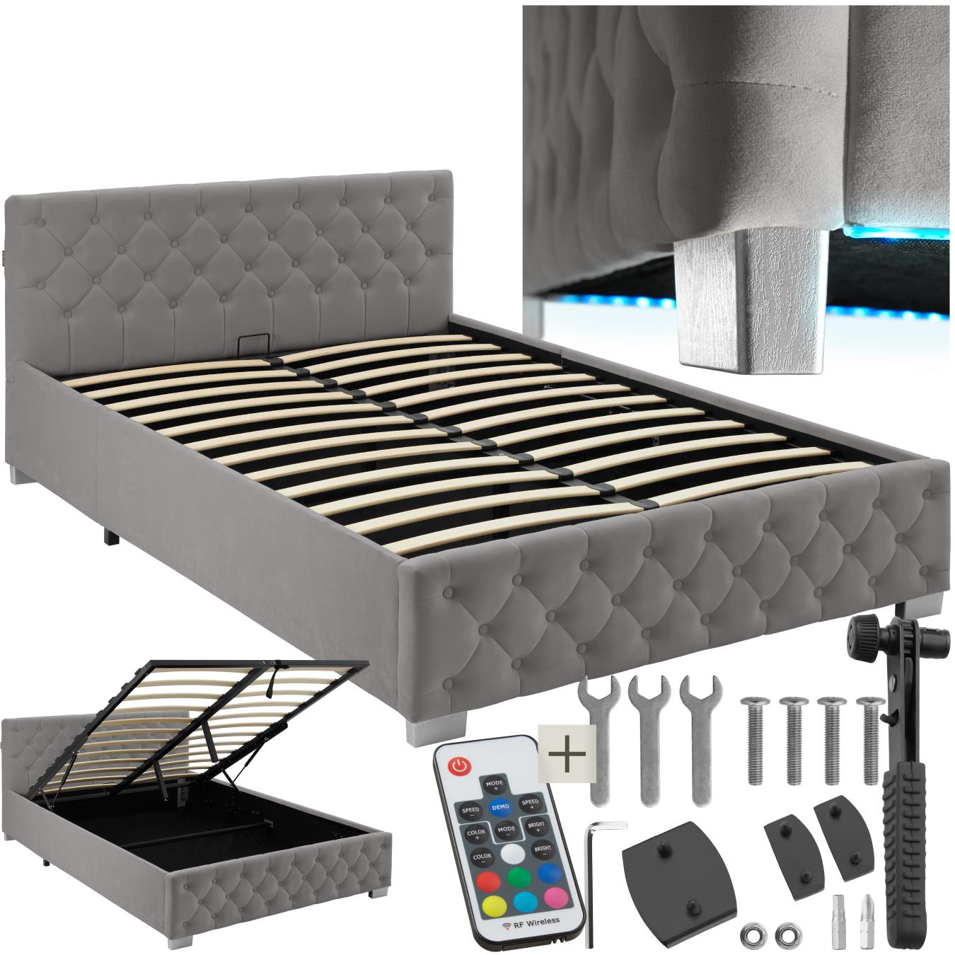 L'éclairage LED intégré, contrôlé par télécommande et offrant différents modes, met en valeur le lit tout en créant une lumière indirecte idéale pour une atmosphère détendue. Le cadre en acier revêtu par poudre solide assure une stabilité exceptionnelle et une capacité de charge élevée. Le sommier à lattes en bois, robuste et optimisé pour le soutien de la colonne vertébrale, peut être facilement relevé grâce à un vérin à gaz pour accéder à l'espace de rangement en dessous.