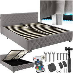 L'éclairage LED intégré, contrôlé par télécommande et offrant différents modes, met en valeur le lit tout en créant une lumière indirecte idéale pour une atmosphère détendue. Le cadre en acier revêtu par poudre solide assure une stabilité exceptionnelle et une capacité de charge élevée. Le sommier à lattes en bois, robuste et optimisé pour le soutien de la colonne vertébrale, peut être facilement relevé grâce à un vérin à gaz pour accéder à l'espace de rangement en dessous.