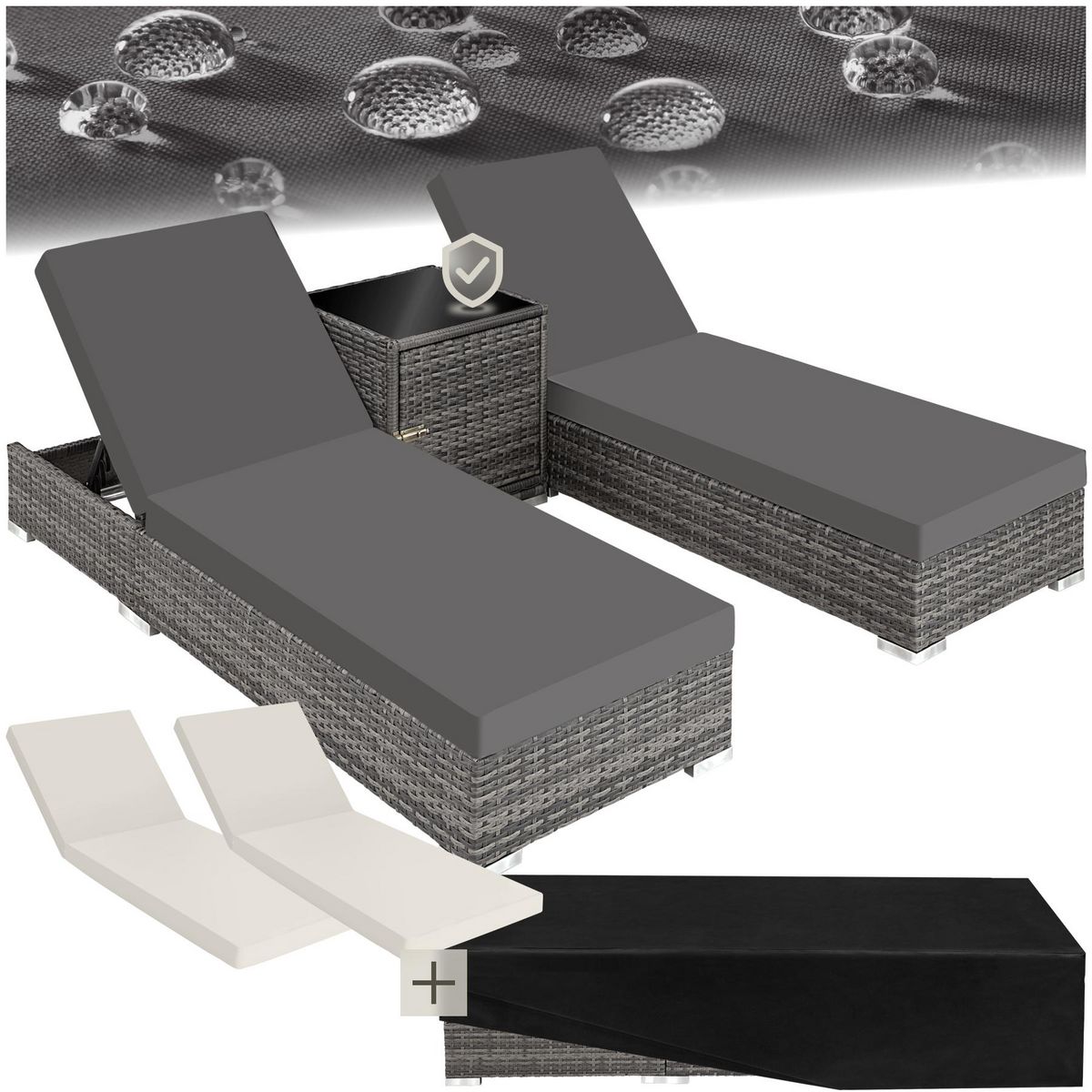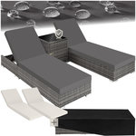 Grâce aux deux housses de protection incluses, vous pouvez ranger les chaises longues de jardin de manière peu encombrante. Il suffit de fermer la porte de la table d'appoint, d'empiler les chaises longues à plat les unes sur les autres et de les recouvrir des housses de protection. Votre ensemble en rotin est ainsi rangé en toute sécurité et prêt pour la prochaine utilisation.