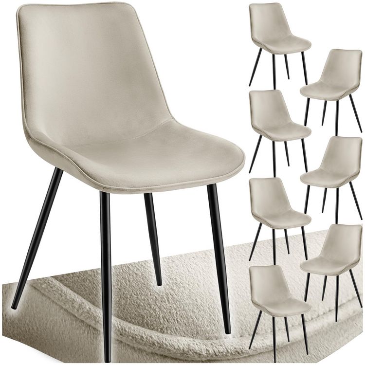 Avec leurs pieds fins et leur revêtement élégant à l'aspect velours raffiné, les huit chaises Monroe de tectake séduisent tout de suite. En y regardant de plus près, cet ensemble charmant a encore bien plus à offrir avec la conception ergonomique de la coque d'assise et le rembourrage confortable. G