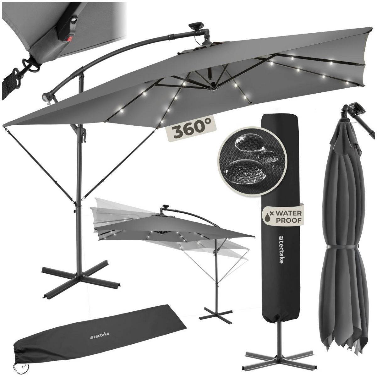 Parasol 250 x 250 cm avec éclairage LED solaire gris clair